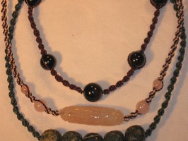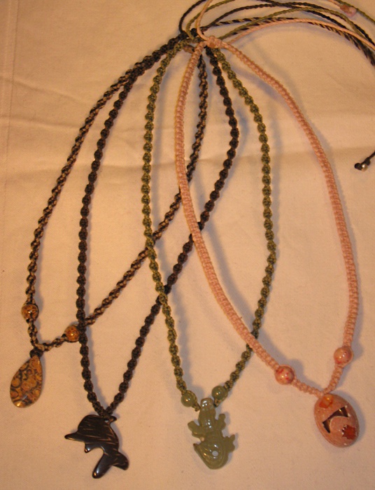 Alle Kettenanhänger können auch mit Makrameekette bestellt werden. Hier von links nach rechts: Jaspis15€, Kokosnuss 13€, Aventurin 15€, Feueropal 17€